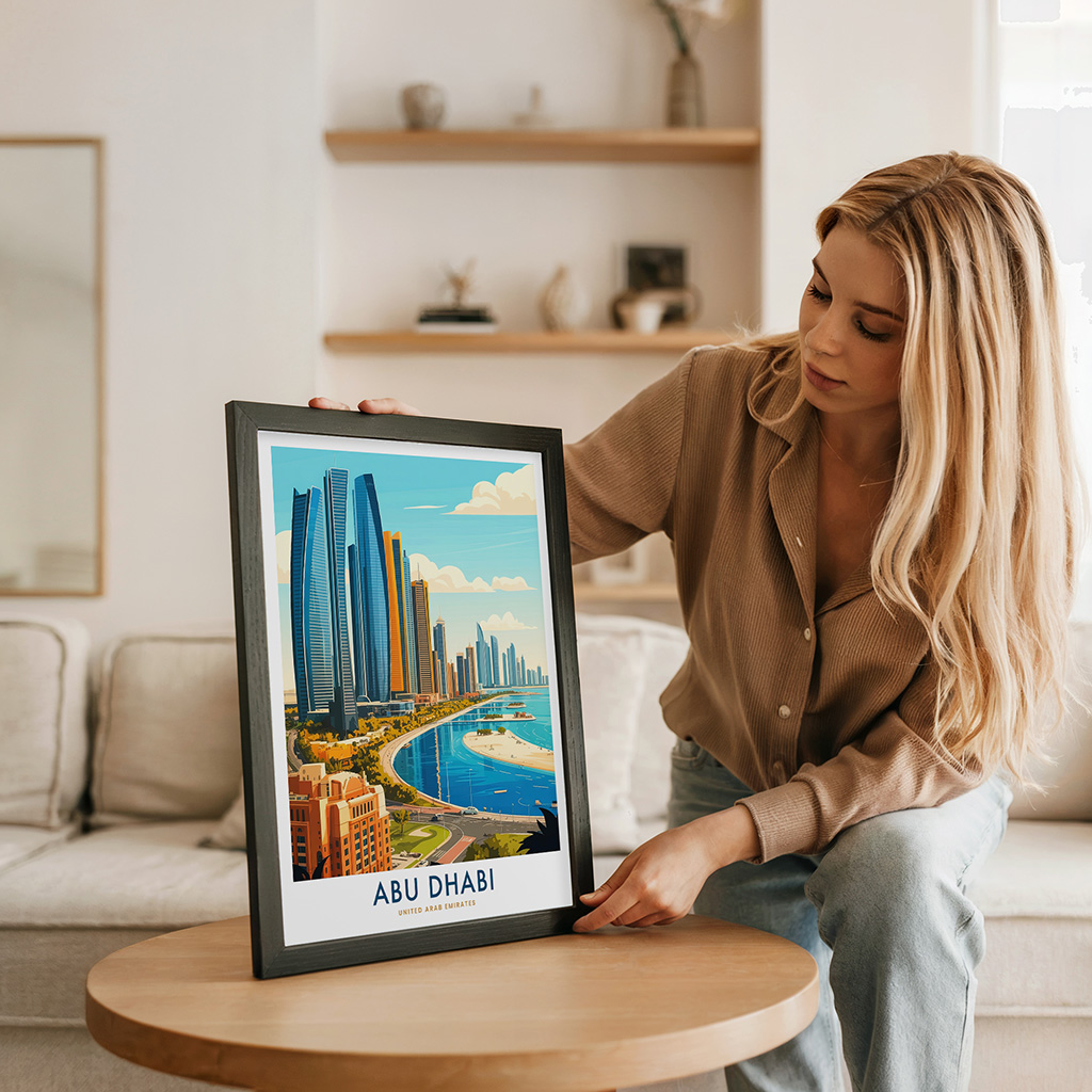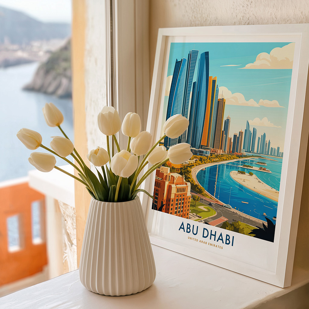 A sleek cityscape art print of Abu Dhabi’s futuristic skyline and coast. Ideal for gallery walls, modern offices, or urban explorers at heart.