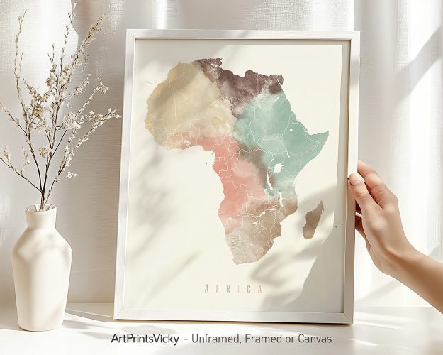 Embark on a journey of discovery with this captivating watercolor map poster of Africa rendered in a warm Pastel Cream palette. This artwork beautifully showcases the continent’s diverse geography in a soft and dreamy style. Perfect for any Africa enthusiast, travel lover, or those who appreciate the beauty of watercolor maps.