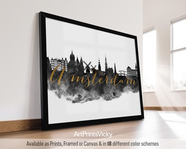 This black and white Amsterdam wall art, designed in watercolor, adds a contemporary flair to any space. Its faux gold title exudes luxury and contrasts beautifully with the city skyline. Perfect for elevating your living area or infusing inspiration into your workspace, this poster is a must-have addition to your home or office gallery.