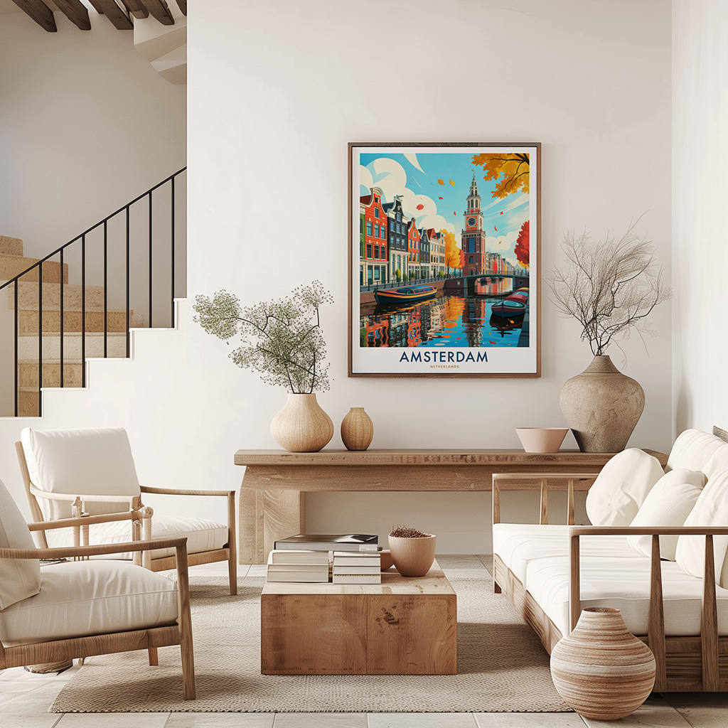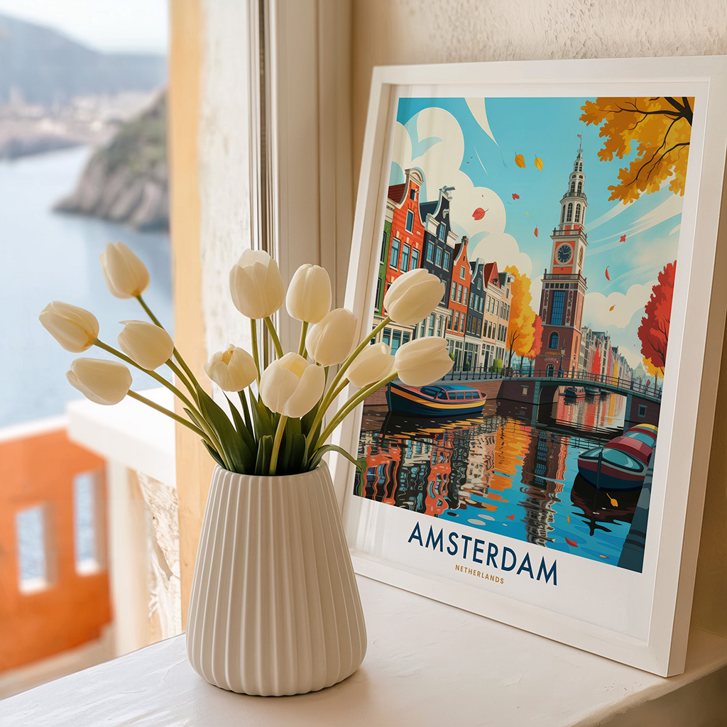 Amsterdam wall art print featuring the city’s iconic canal houses, clock tower, and boats on reflective waters. Perfect for home or office decor, this travel poster captures the beauty of Amsterdam’s historic waterways and makes a meaningful gift for European art and travel lovers.
