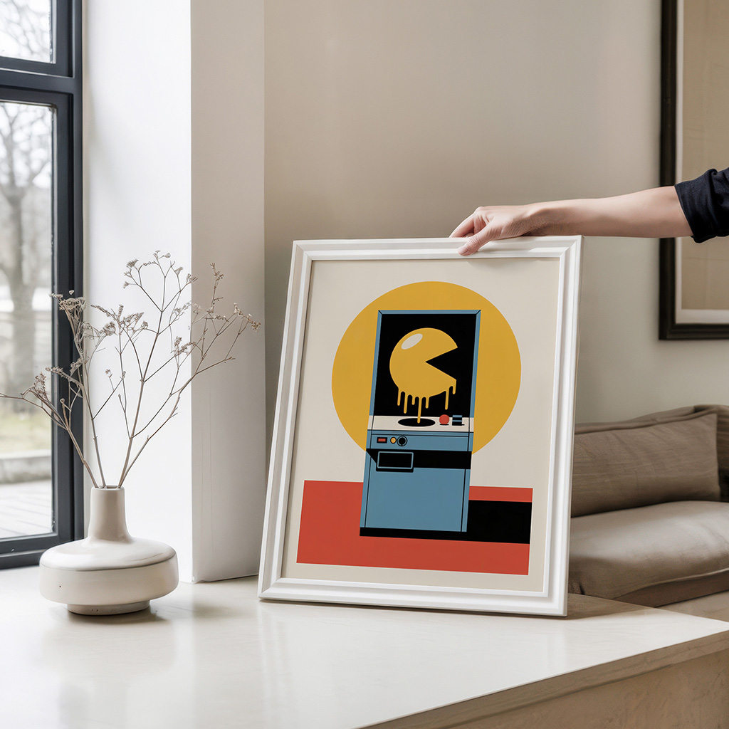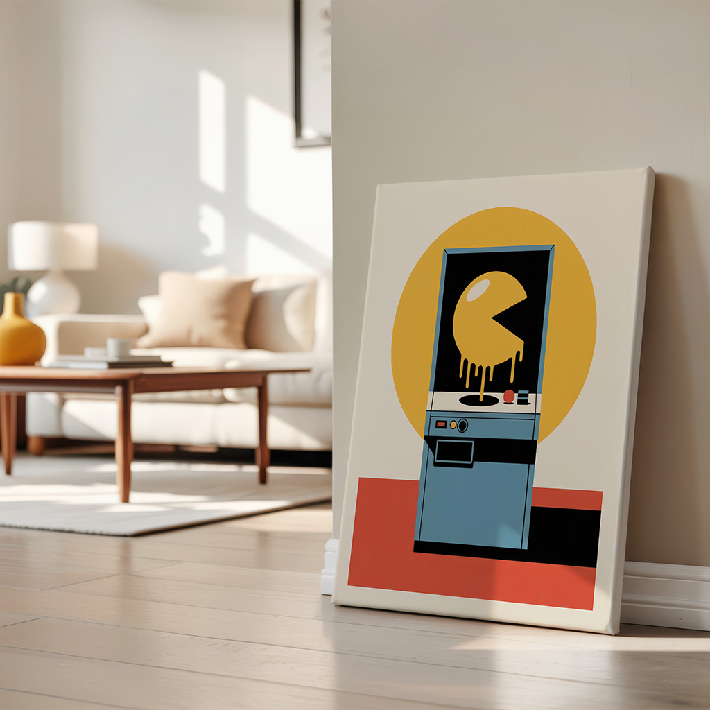 Retro arcade maze game artwork in bold 80s pop art style, perfect gift for gamers and vintage decor fans.