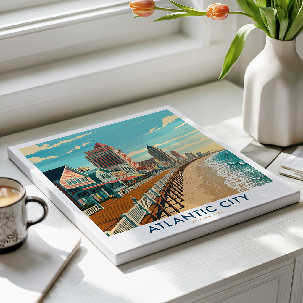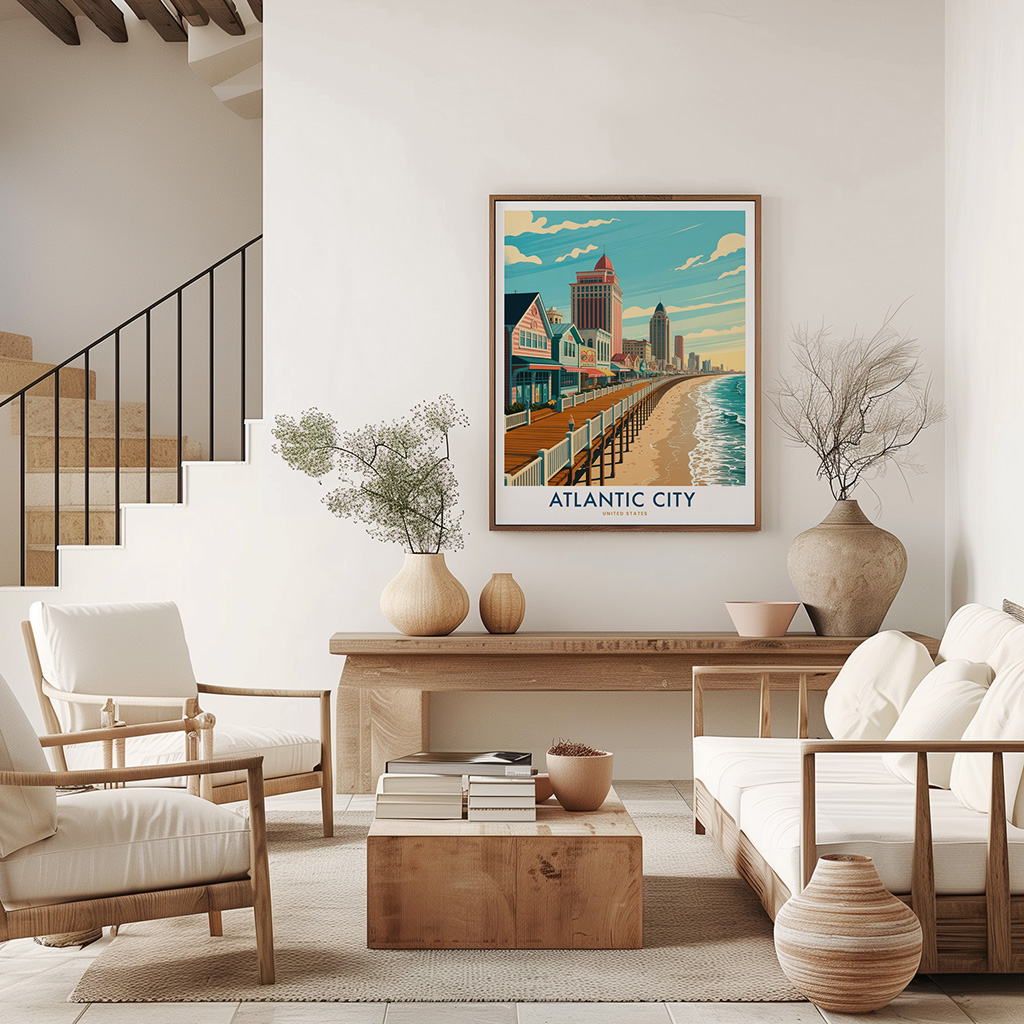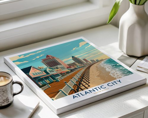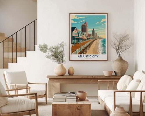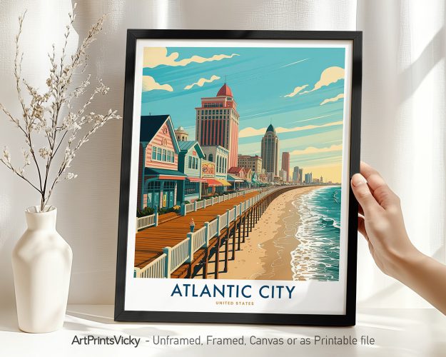 Immerse yourself in the lively atmosphere of the shore with this Atlantic City art print, featuring its famous boardwalk and beach. Ideal for New Jersey natives, beach house decor, or anyone who loves vibrant coastal scenes and unique city art.