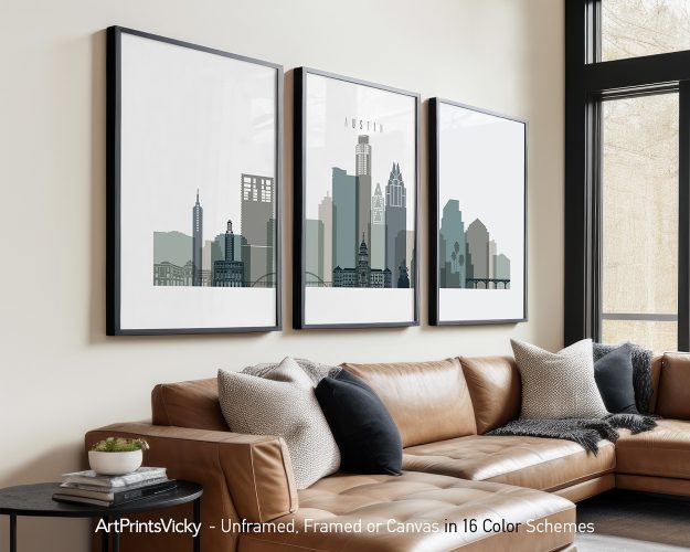 Looking to add an art piece of Austin to your space? This set of 3 prints, in earth tones 4 style, is the perfect addition. The skyline depictions bring a slice of the city to any room. A thoughtful gift that will be cherished.