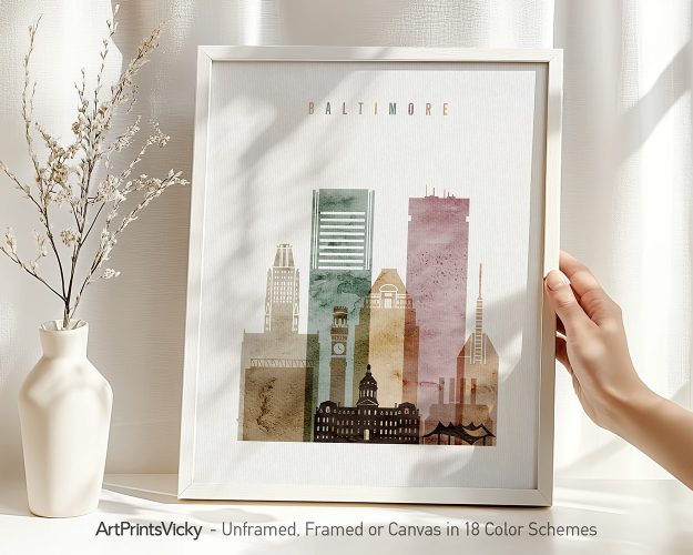Adorn your home or office with the timeless beauty of Baltimore’s skyline. Our watercolor 1 theme, wall art print adds a touch of elegance and serenity to your living space.