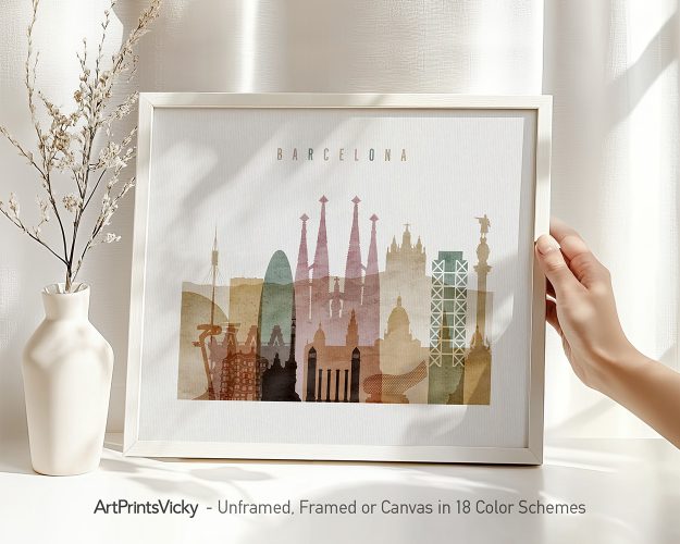 This unique Barcelona poster exudes coziness and warmth. This Barcelona art print, presented in watercolor 1 warm palette, offers a minimalist look that’s both distinctive and elegant. It’s a perfect choice for a home library or office, and makes a memorable birthday gift!