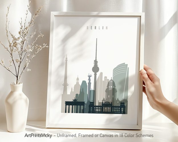 A sophisticated Berlin skyline wall art print featuring the city’s iconic architecture in earth tones 4 style. This contemporary design captures the urban beauty of the city in an elegant minimalist style, perfect for modern home decor or as a thoughtful gift to celebrate special occasions.