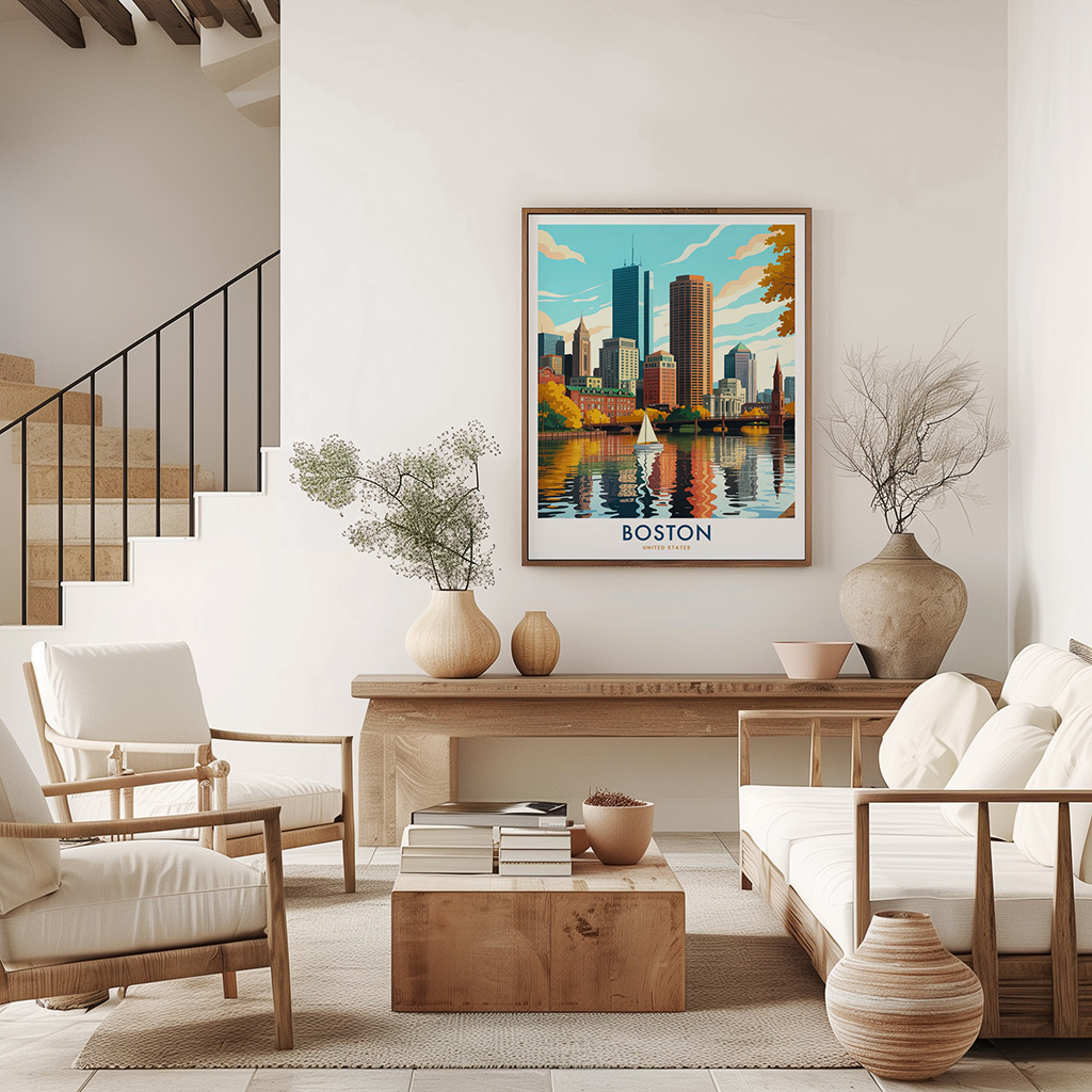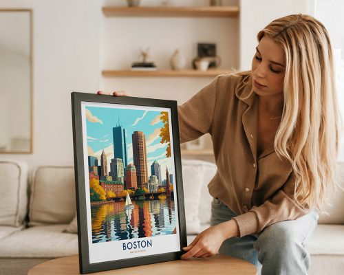 Boston skyline art print featuring the city’s blend of historic and modern landmarks by the waterfront. Perfect for home or office decor, ideal for city lovers, travel enthusiasts, and anyone seeking stylish modern wall art inspired by Boston.