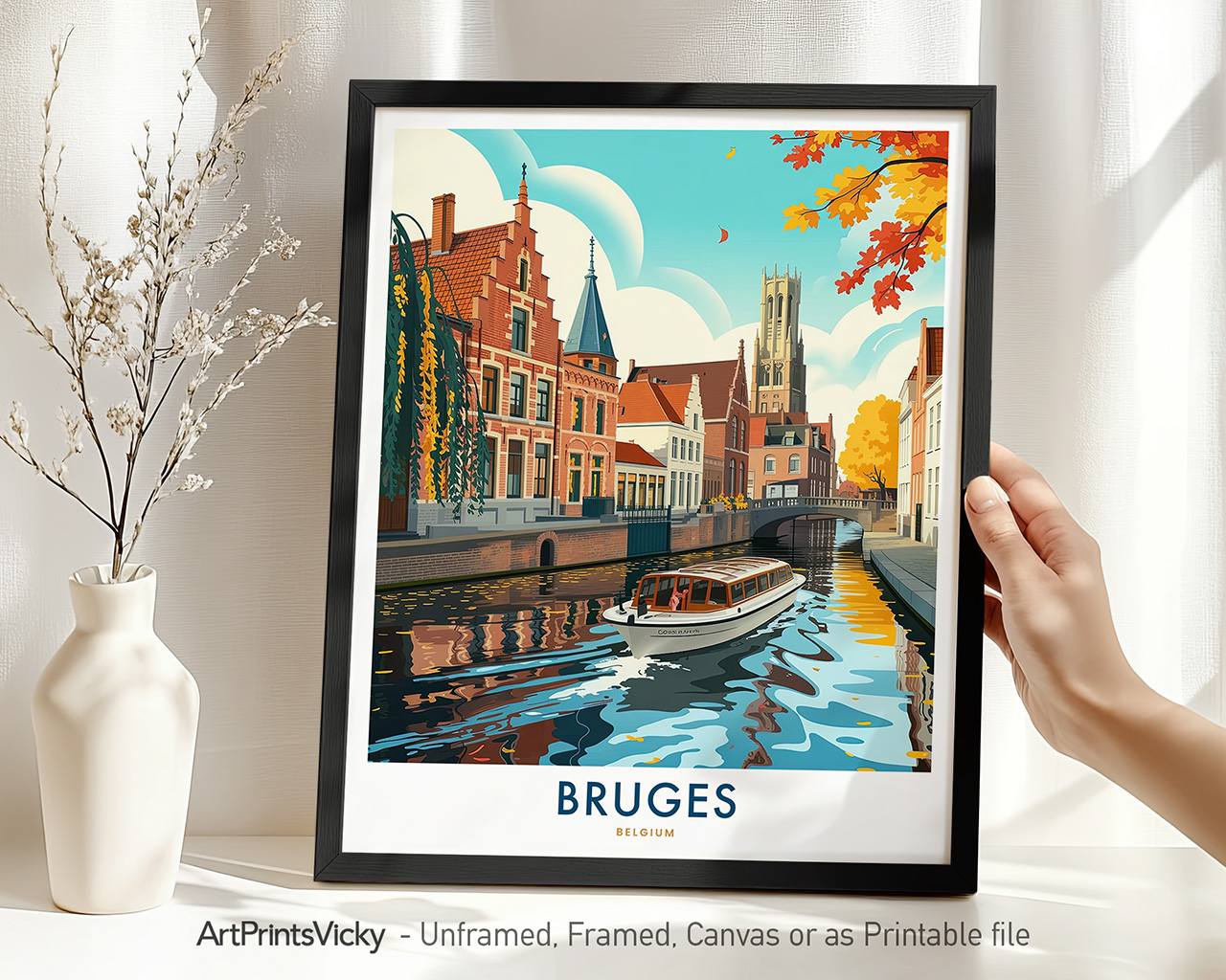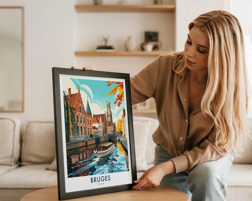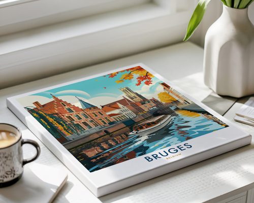 Bruges art print capturing the city’s peaceful canals, soft reflections, and timeless architecture. Perfect for home or office decor, ideal for travel lovers, European art enthusiasts, and anyone seeking charming Belgian city wall art.