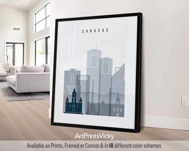 Imagine bringing the Caracas skyline print into your bedroom with this wall art in grey-blue hues. This Caracas poster is an excellent choice for bedroom decor and beyond, creating a sophisticated atmosphere in any space. It also makes for a unique gift, allowing your friends and family to enjoy the iconic views of the city every day.