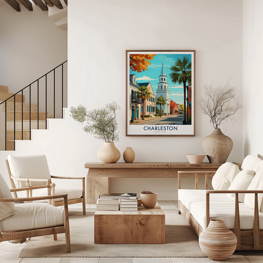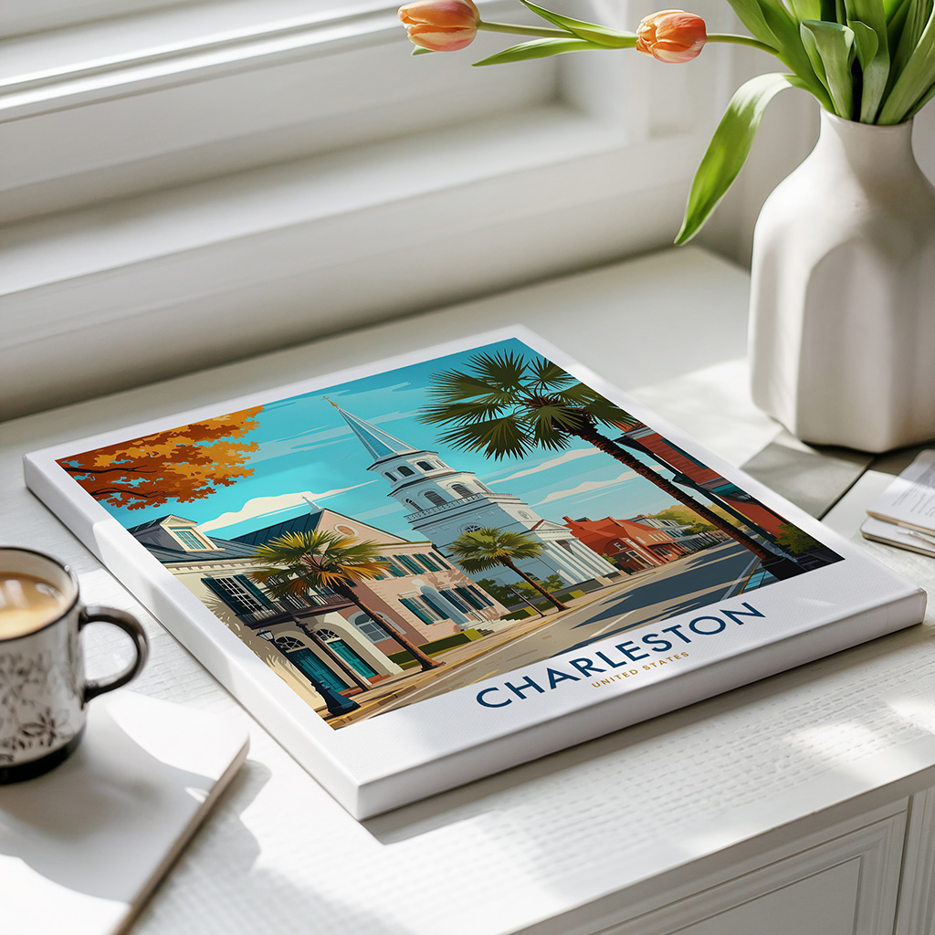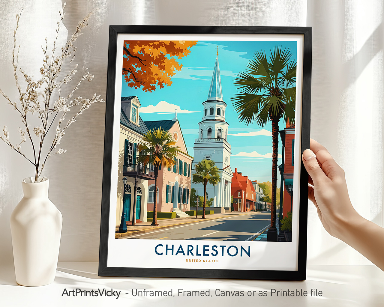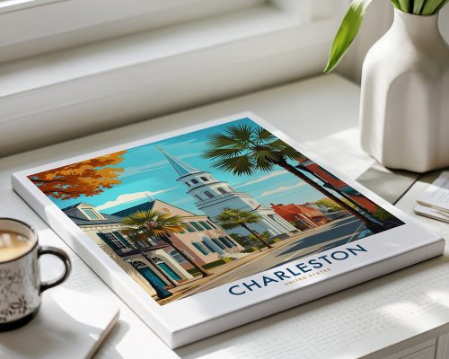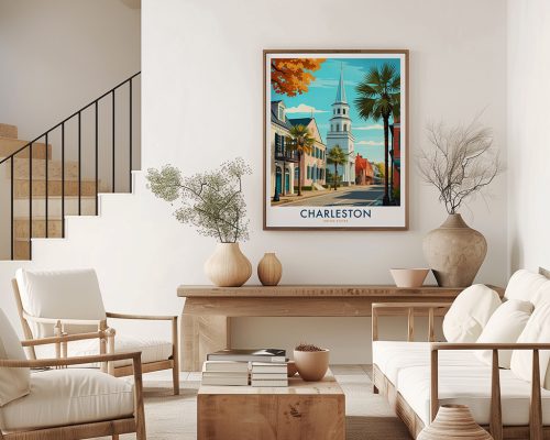 Charleston wall art print capturing the city’s timeless Southern charm with its elegant streets and historic church spires. A beautiful addition to any home or office, perfect for those who appreciate classic American heritage and coastal sophistication.