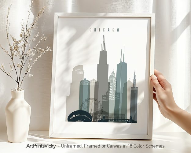 A beautiful Chicago wall art print showcasing the city’s skyline in earth tones 4 hues, perfect for adding a touch of elegance and urban charm to any space. Wish the newlyweds a lifetime of happiness with this exquisite print, a memorable wedding gift that will adorn their home with warmth and love.
