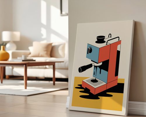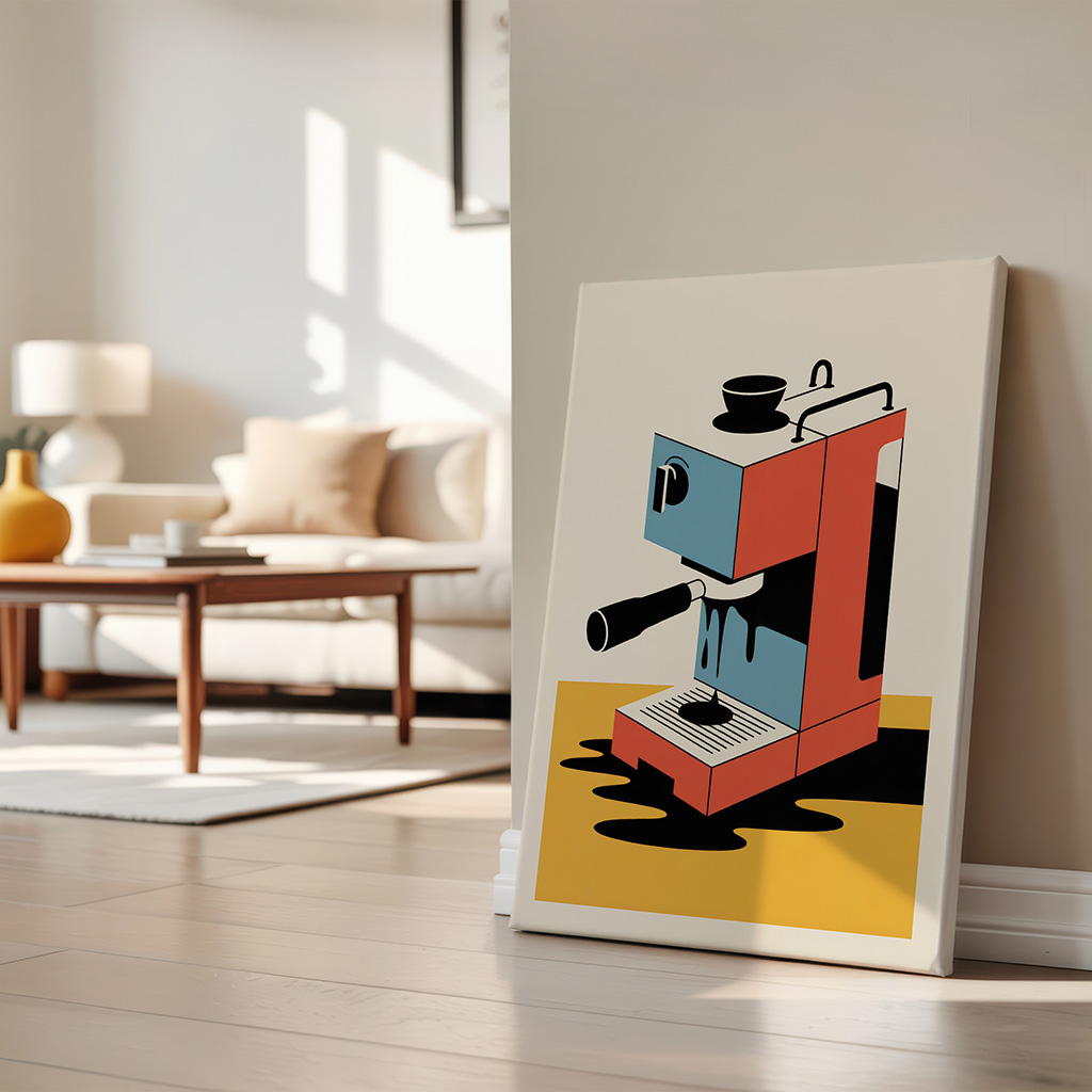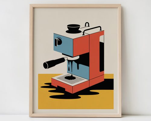 Art print of a melting retro coffee machine, in Bauhaus style, quirky decor for kitchens and coffee lovers.