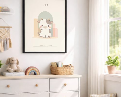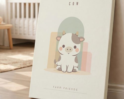 Personalized cow nursery wall art in soft neutral tones. This minimalist Farm Friends print is perfect for modern nurseries and makes a thoughtful custom baby gift. Choose from unframed print, wooden frame, or wrapped canvas. Add baby’s name, birth date, or a sweet quote.