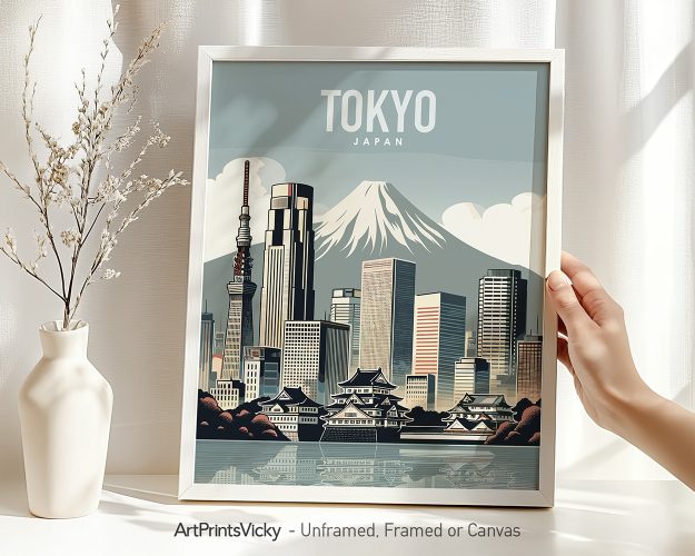 Experience the vibrant energy of Tokyo with this captivating travel poster in smooth colors. Capturing Tokyo’s dynamic skyline, from the iconic Tokyo Tower to the majestic silhouette of Mount Fuji, every detail narrates a tale of Japan’s vibrant capital. A seamless fit for both modern and classic interiors, ideal for any room in the house or office.