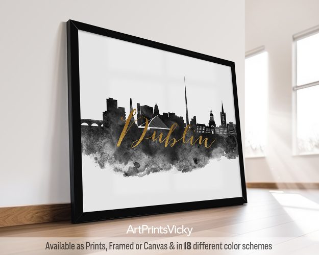 This watercolor black and white Dublin art print offers a modern touch to your space and will be a great addition to your home or office wall gallery. The faux gold title adds a touch of luxury and creates a striking contrast against the city skyline. Whether you’re looking to enhance your living area or create an inspiring atmosphere in your workspace, this poster is ideal!