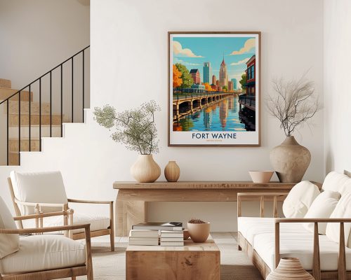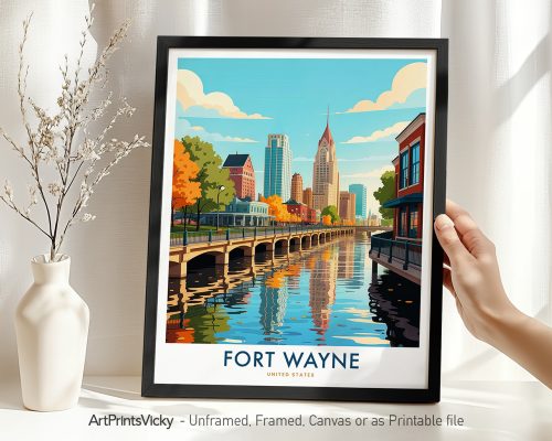 Fort Wayne Indiana art print featuring the scenic riverfront and skyline. Perfect for home or office decor, ideal for local residents, Midwest art lovers, and anyone seeking unique city-inspired wall art.