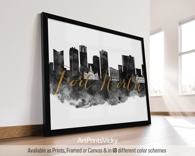 This black and white Fort Worth cityscape wall art, rendered in watercolor, adds a contemporary flair to any space. Its faux gold title exudes luxury and contrasts beautifully with the city skyline. Perfect for elevating your living area or infusing inspiration into your workspace, this poster is a must-have addition to your home or office gallery.