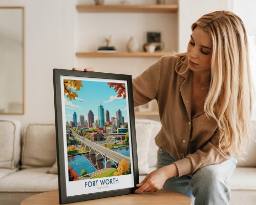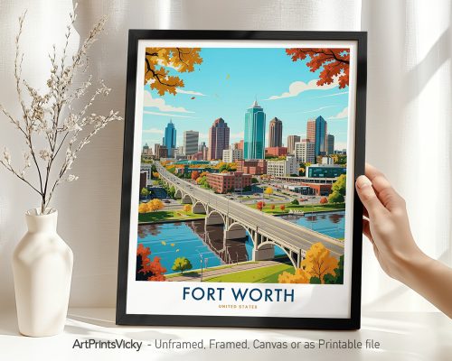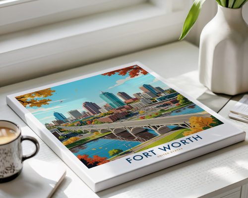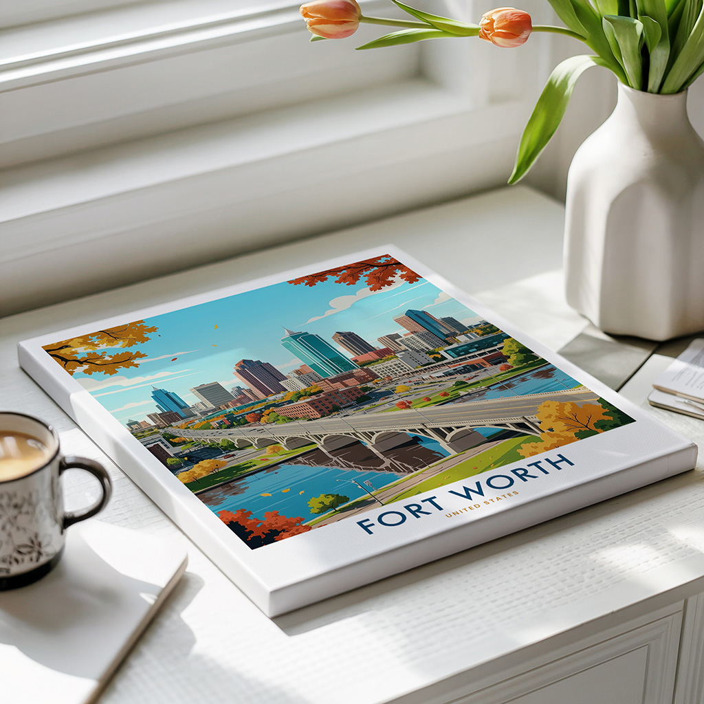 This Fort Worth cityscape wall art print shows the city’s downtown bridges in bright, crisp colors. Perfect for modern Texas-themed home or office decor.