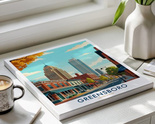 Greensboro cityscape wall art print capturing the modern urban landscape. Perfect for home or office decor, ideal for local pride, contemporary design lovers, and anyone who appreciates unique Southern city wall art.