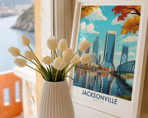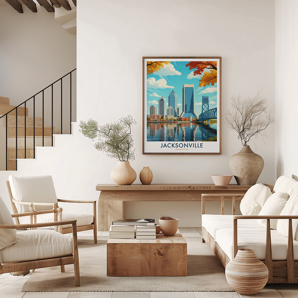 Jacksonville wall art print featuring a dynamic cityscape with colorful Florida vibes. Great for adding energy and style to any room or as a thoughtful gift for city and travel lovers.