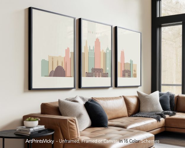 - Composition: Triptych set consisting of 3 separate art pieces (Typography, Map, and Skyline/Artistic print).