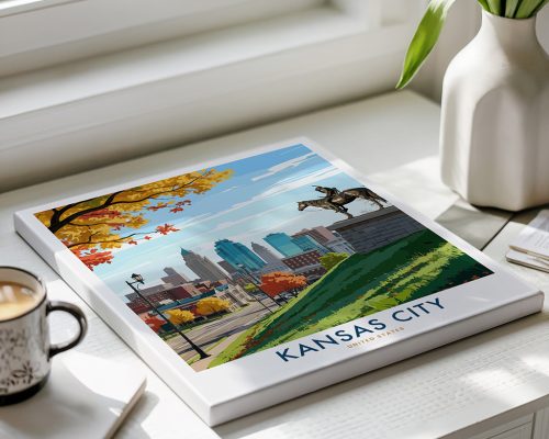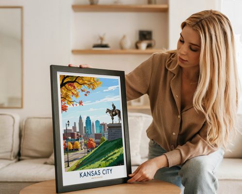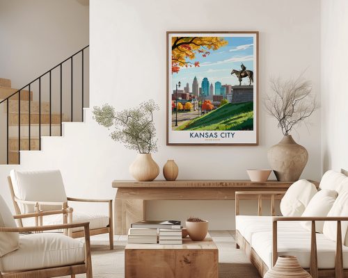 Kansas City skyline poster featuring the historic Scout statue and downtown view. Perfect for home or office decor, this retro travel poster captures the city’s character and charm, making it an ideal gift for Kansas City lovers and travel art collectors.