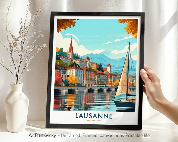 Lausanne cityscape wall art print – stunning alpine lake and historic architecture. Great for home, office, or studio decor, and a thoughtful gift for travelers and art lovers alike.