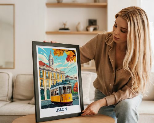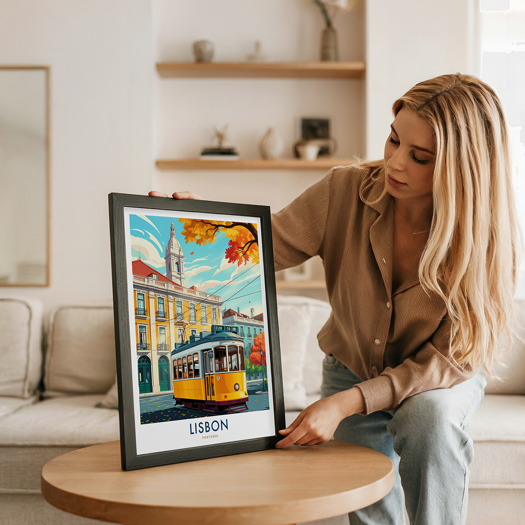 Lisbon wall art print featuring the city’s iconic yellow tram, pastel buildings, and historic bell tower. Perfect for home or office decor, this travel poster captures the romantic charm of Portugal’s capital and makes a thoughtful gift for European city and travel lovers.