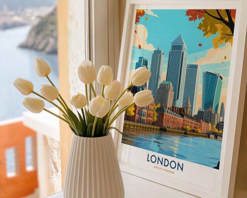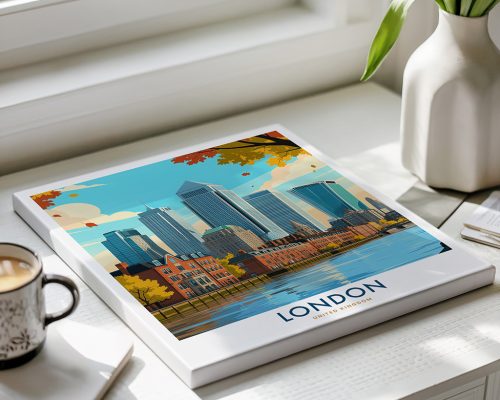 A sleek travel poster of London’s Canary Wharf cityscape, perfect for modern interiors, city lovers, and fans of urban minimalism. Perfect for those who appreciate modern design, this skyline artwork complements various décor styles and makes an eye-catching statement in any setting.