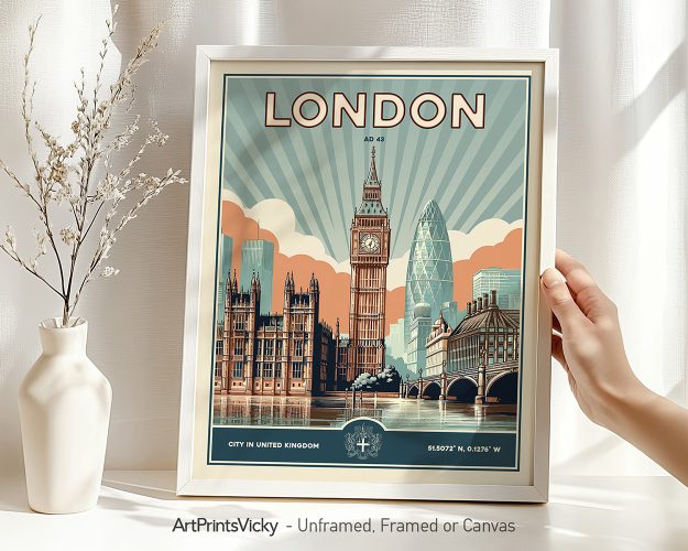 This London print, showcasing the city’s most famous landmark like Big Ben. This poster transporting you to the heart of the United Kingdom’s capital and it’s an excellent gift for lovers of London or as a sophisticated addition to your own space.