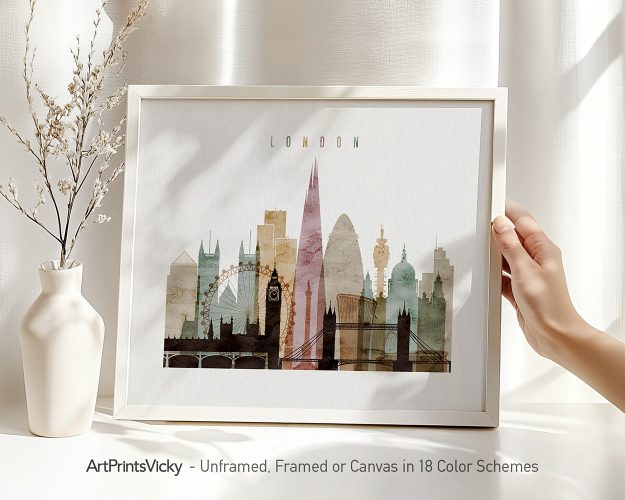 Looking for a perfect wall art print for an urban vibe in your space? This London poster is ideal for infusing your space with the energy of the city. With its watercolor 1 style, it captures the essence of London’s skyline in a beautiful and unique way. This piece makes an exceptional gift.