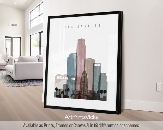 Refresh your space with this Los Angeles city poster. This wall art, in distressed 1 style, highlights the essence of city’s skyline and famous landmarks, perfect for your living room, bedroom, or office. A lovely gift for a wedding.