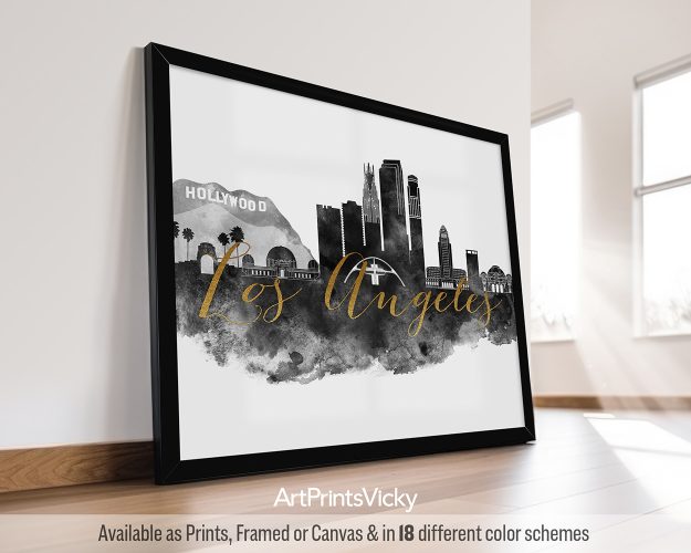 With this stunning Los Angeles art print you can start to create your new modern wall gallery. The faux gold title adds a touch of luxury and creates a striking contrast against the city skyline. Whether you’re looking to enhance your living area or create an inspiring atmosphere in your workspace, this watercolor poster is ideal!