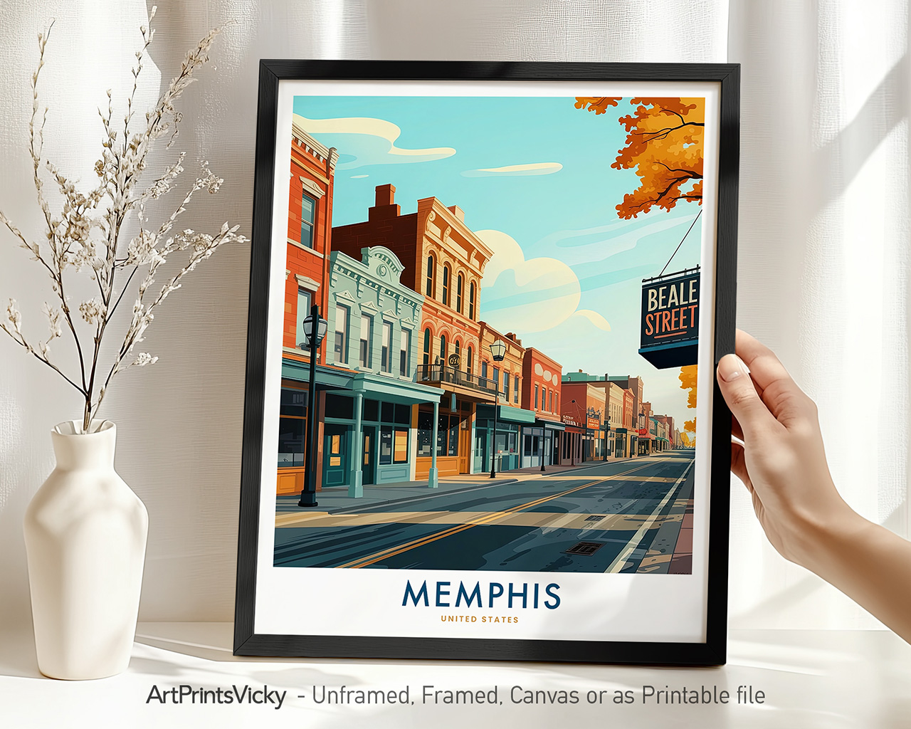 Bring the soul of Beale Street to your space with this historic Memphis street scene, perfect for music lovers and Southern decor. It’s a versatile decor piece for your home, office, or studio space.