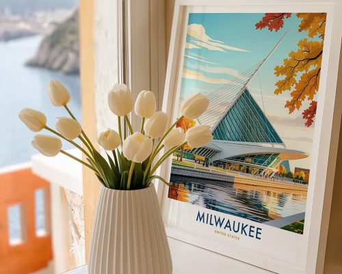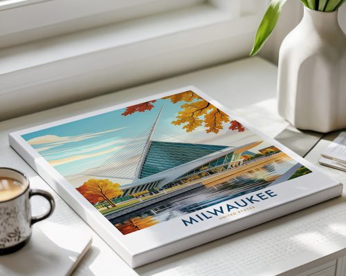 Celebrate Milwaukee’s iconic modern architecture with this bold city print, combining traditional design techniques — perfect for home decor or as a unique gift.