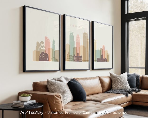 Minimalist and sophisticated, this 3-piece Minneapolis poster set brings the city’s essence to life. Featuring, in pastel cream palette, the iconic cityscape, each piece seamlessly captures the architectural landmarks of Minneapolis. The sleek design complements modern decor while adding a touch of urban elegance to any living space.