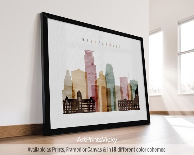 Looking for a perfect wall art print for an urban vibe in your space? This Minneapolis poster is ideal for infusing your space with the energy of the city. With its watercolor 1 style, it captures the essence of Minneapolis’ skyline in a beautiful and unique way. This piece makes an exceptional gift.