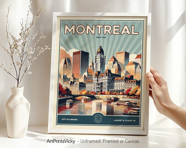Immerse yourself in the vibrant culture of Montreal with this elegantly crafted poster print. Inspiring the city’s stunning architecture and the serene beauty of the waterfront, this wall art print encapsulates the essence of Montreal’s diverse spirit. A perfect memento for anyone who’s left their heart in Montreal.