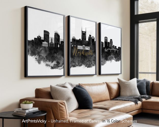 Bold, dynamic, and visually striking, this black and white watercolor of Nashville poster set, commands attention with its “golden” title at the center. A perfect triptych for those looking to enhance their home decor, this set of 3 prints makes an excellent gift for friends and family.