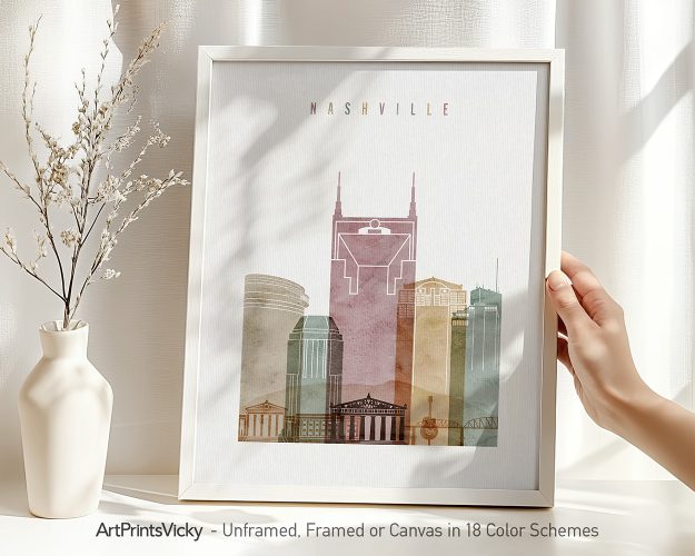 Travel to the heart of Nashville with this skyline wall art print, perfect for brightening someone’s day as a ‘just because’ gift. With its warm watercolor 1 palette, this poster adds a sophisticated charm to any space in your home or office.
