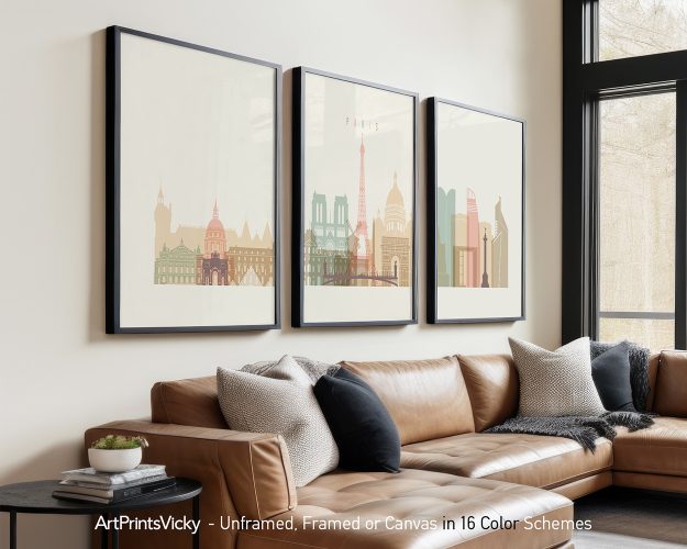 - Composition: Triptych set consisting of 3 separate art pieces (Typography, Map, and Skyline/Artistic print).