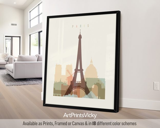 An artistic city print of Paris skyline in pastel cream hues. An ideal poster to bring a touch of the city’s charm to your living space, bedroom, or office. A delightful gift for anniversaries or housewarmings.