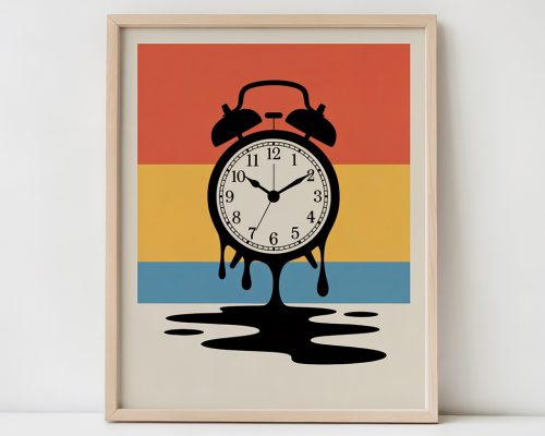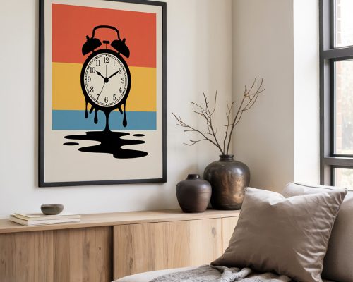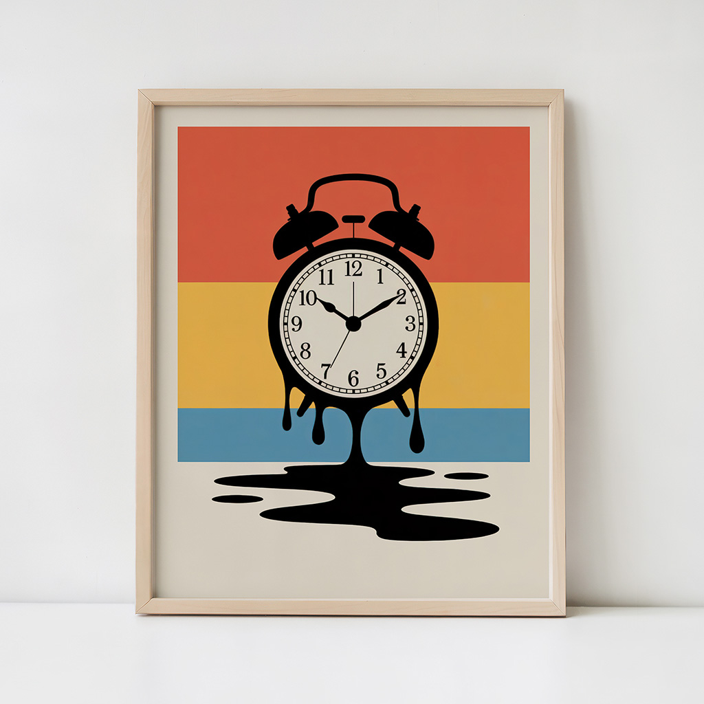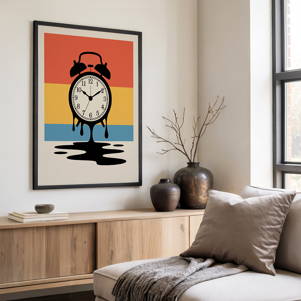 Bold pop art wall print of a melting retro alarm clock, in Bauhaus style. Perfect gift for vintage lovers and quirky home decor.