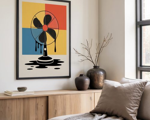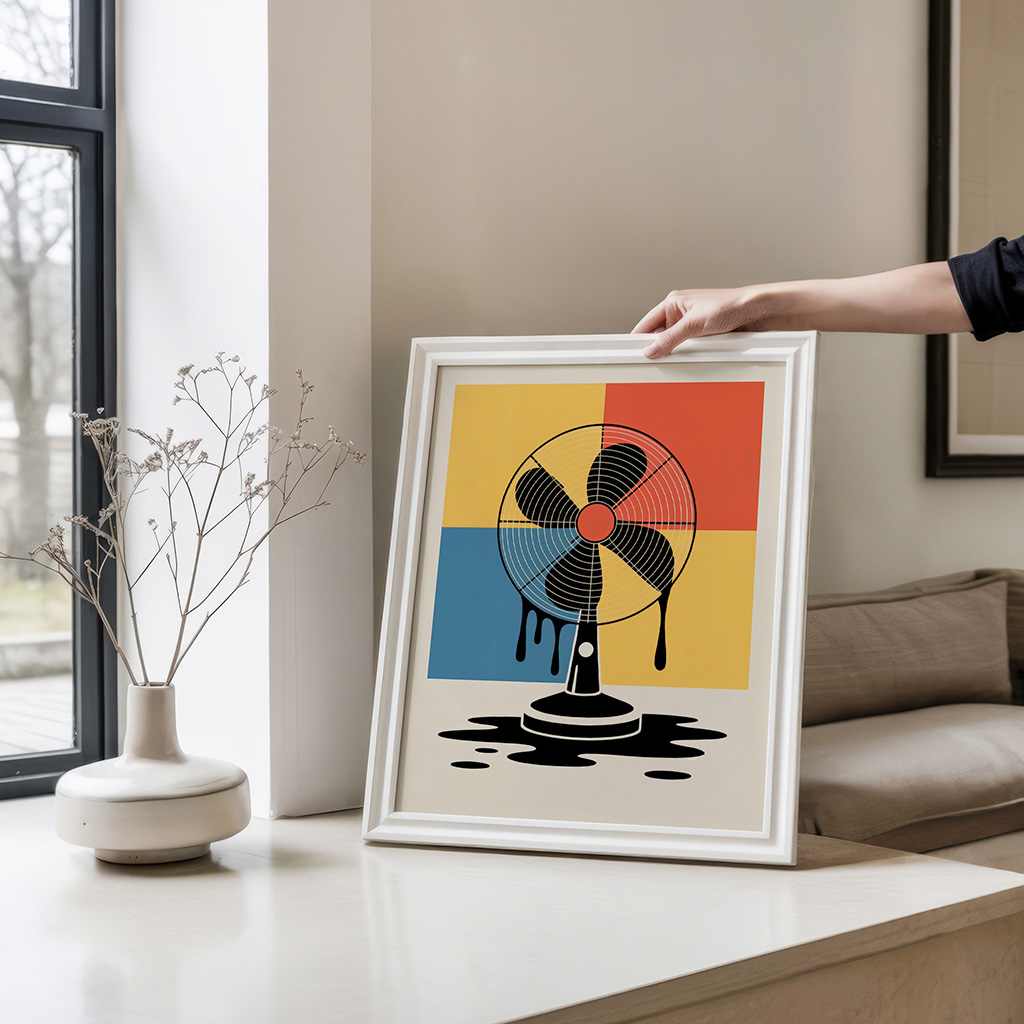 Nostalgic pop art print of a classic desk fan in bauhaus style. Perfect for retro-themed rooms, offices, or as a unique vintage decor piece.