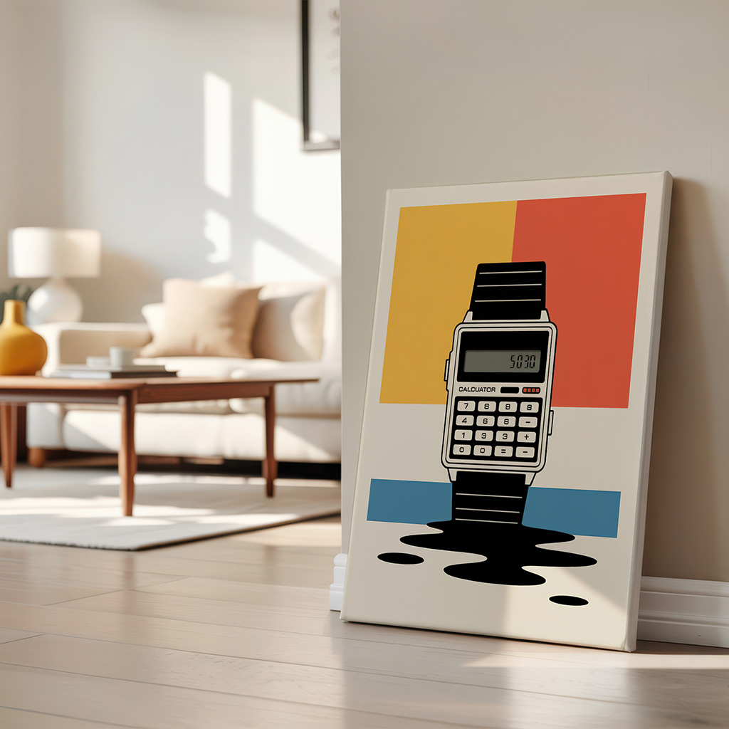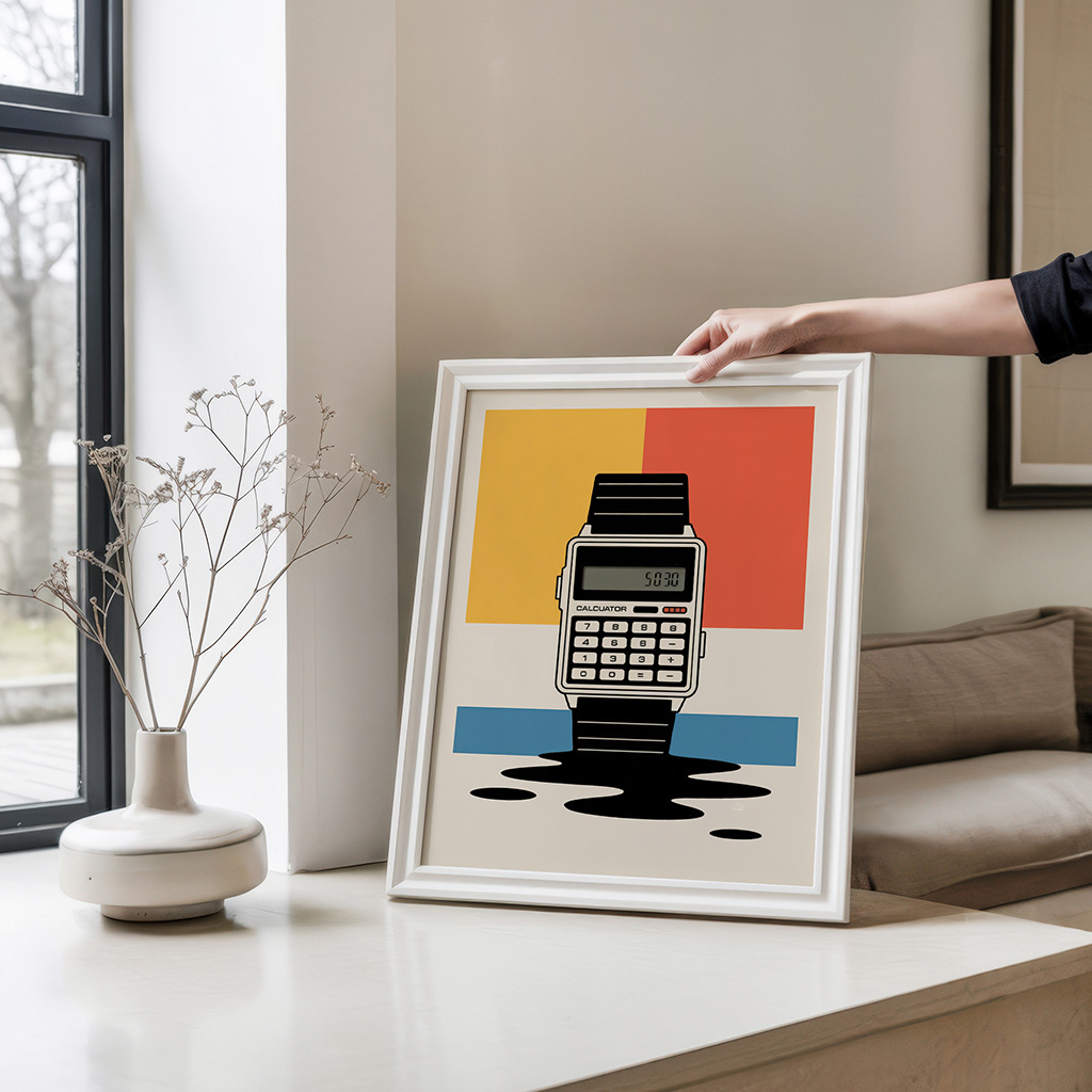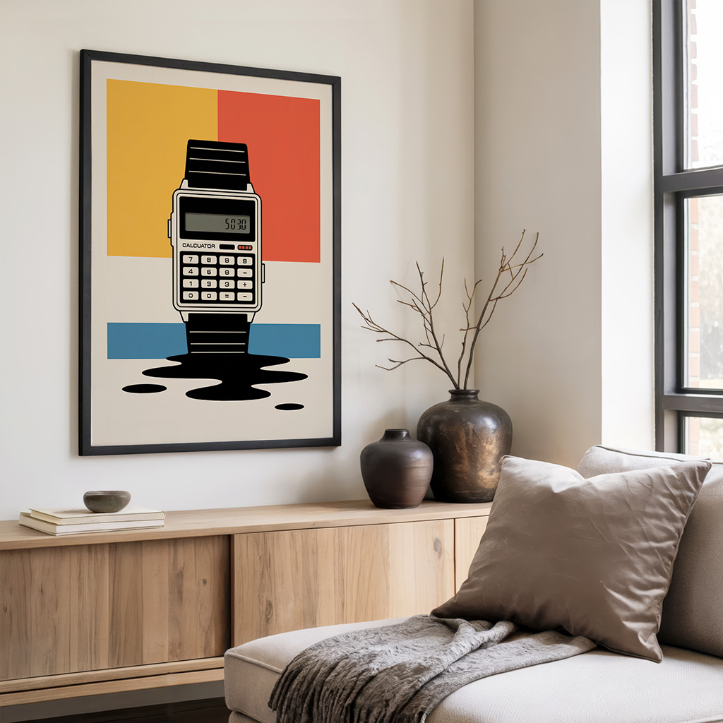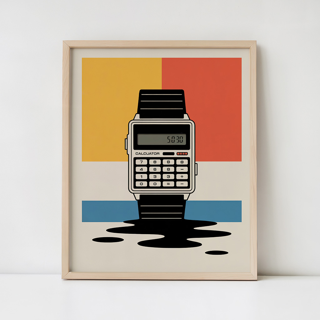 Pop art wall print of a melting retro digital watch, perfect retro gift for tech fans.