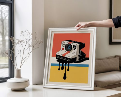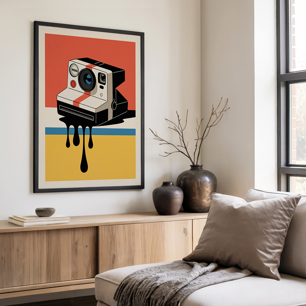 Nostalgic pop art of a melting instant camera, in Bauhaus style, perfect retro print for photography lovers.