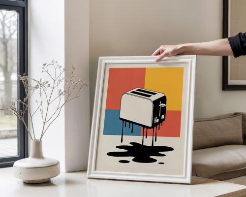 Stylish pop art print of classic toaster in bauhaus style. Ideal for kitchens, breakfast nooks, or retro appliance collectors’ spaces.
