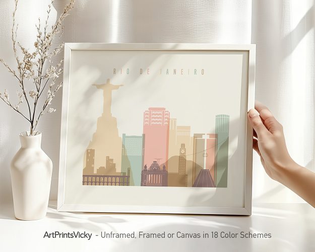 Showcase your love for Rio de Janeiro with this pastel cream skyline print, designed for contemporary home decor. Brighten someone’s special day with this charming poster, a thoughtful birthday gift that adds a touch of joy and character to their space.