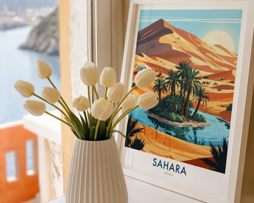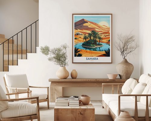 Escape to the beauty of the Sahara with this desert oasis art print. Featuring serene waters and palm trees, it’s perfect for nature lovers, exotic travel enthusiasts, and anyone seeking a unique, calming landscape for their space.