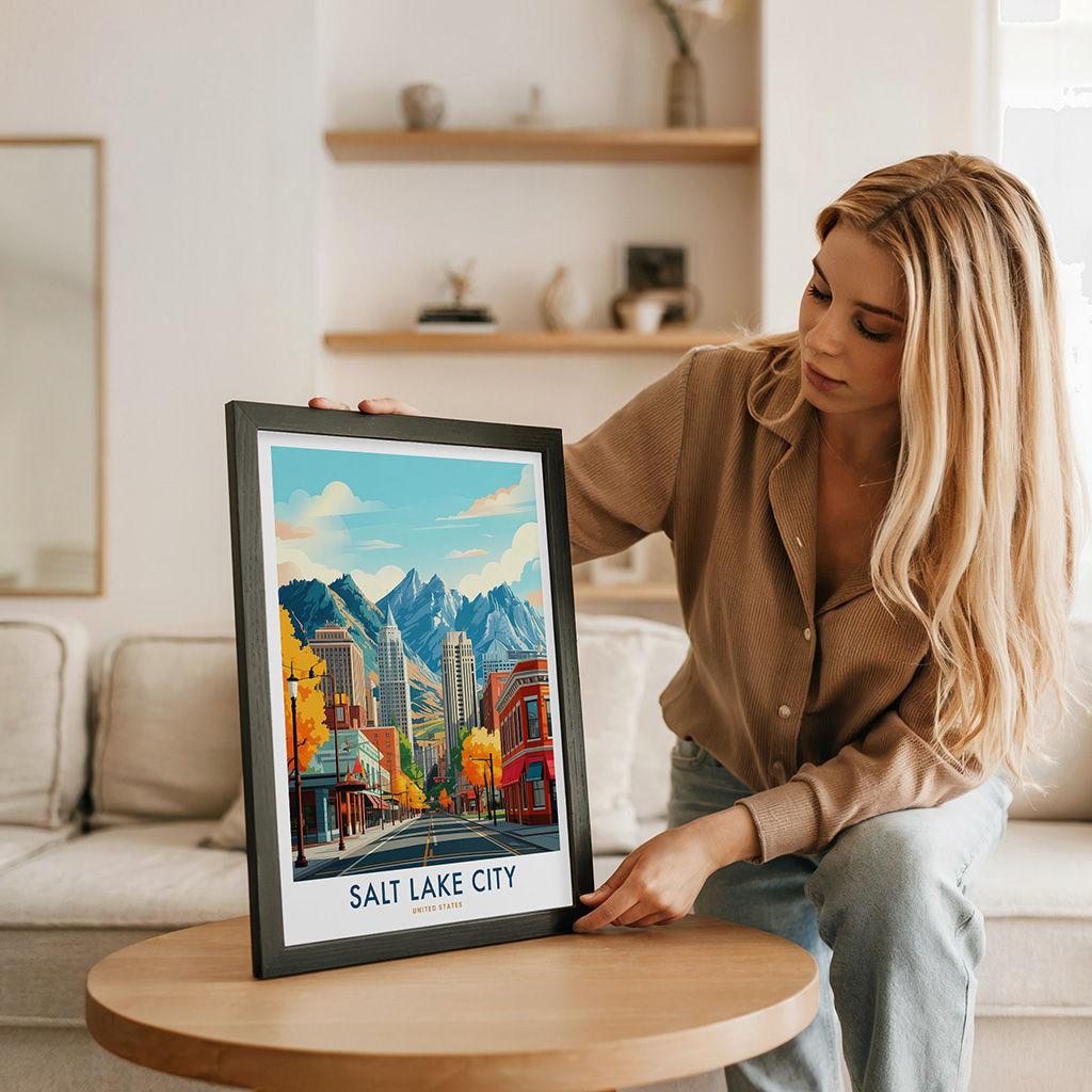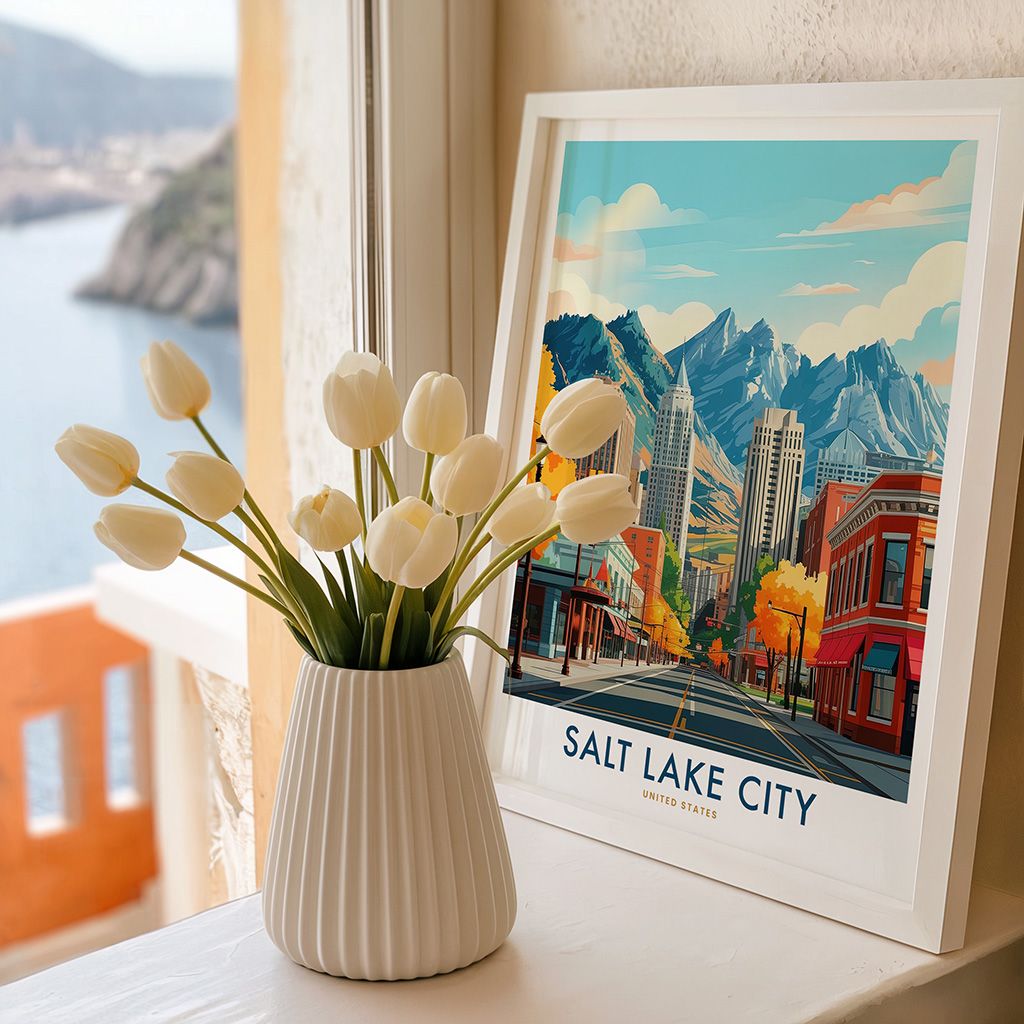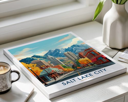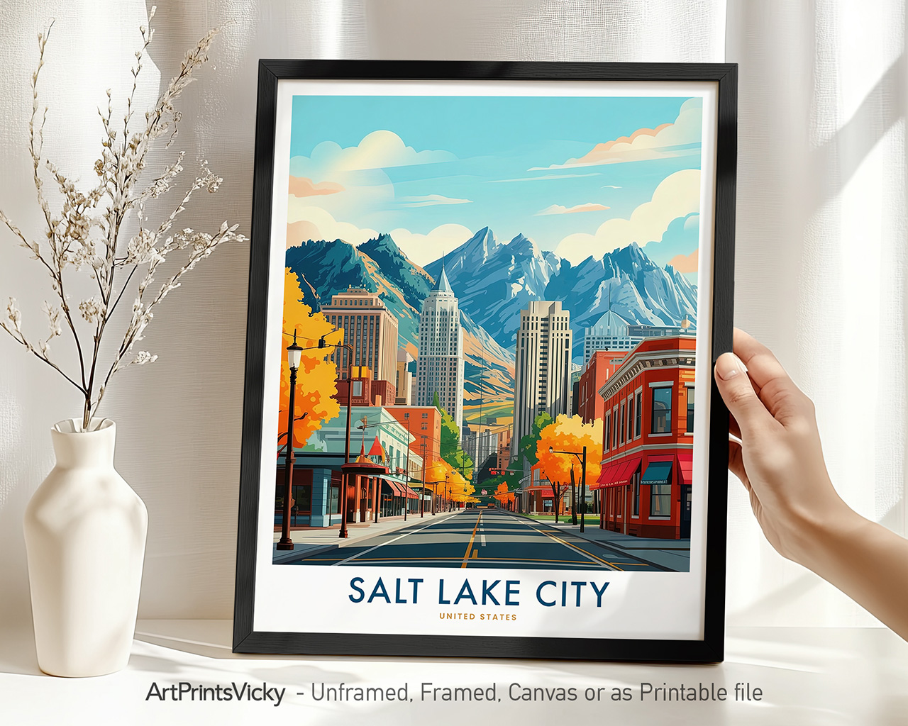Embrace the blend of urban and natural beauty with this Salt Lake City cityscape poster. Ideal for Utah enthusiasts, outdoor lovers, and those seeking vibrant, inspiring city and landscape wall decor.